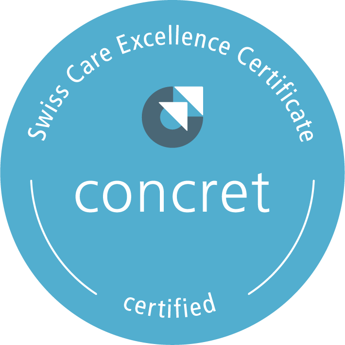 Ein wichtiges Qualitätssystem in unserer Pflegepraxis sind die Indikatoren von Swiss Care Excellence Certificate SCEC. Als eine der wenigen Langzeitpflegeinstitutionen in der Schweiz hat die Pflege der jetzt Frutigland AG das Swiss Care Excellence Certificate erlangt. Die Zertifizierung durch die Concret AG bezeugt das erfolgreiche Arbeiten mit einem geeigneten Qualitätsmanagementsystem. Damit ist sichergestellt, dass die Pflegequalität laufend überprüft und verbessert wird – zum Nutzen der Bewohnenden, deren Angehörigen und zur Erfüllung der gesetzlichen Vorgaben.
